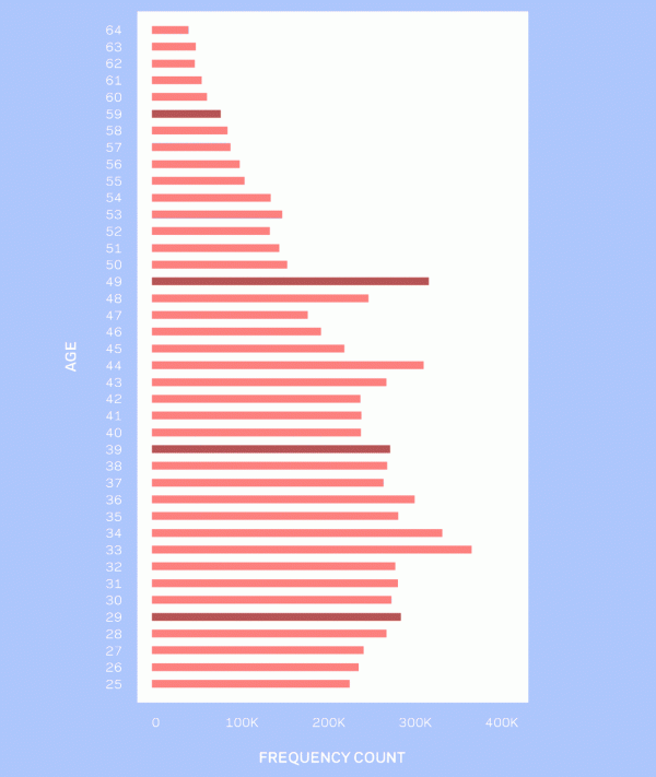 Selon une étude de l’University of New Hampshire, l'homme atteindrait son pic d'infidélité à l'âge de 55 ans. D'après le site de rencontres extra-conjugales Ashley Madison, les hommes auraient en fait tendance à tromper leur partenaire juste avant que leur âge n'atteigne un chiffre rond, soit à 29, 39 et 49 ans, comme vous pouvez le voir ci-dessous.