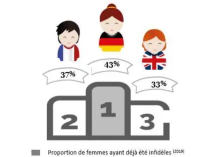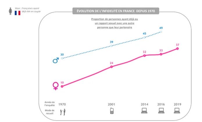 “En 2019, elles sont 37% à admettre avoir déjà fait l’amour avec une autre personne que celle avec laquelle elles étaient en couple, soit une proportion qui a progressé de manière continue au cours des 50 dernières années, passant de 10% en 1970, à 24% en 2001 puis à 32% en 2014.
