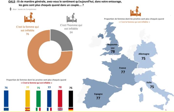 Sur les 1004 femmes françaises de 18 ans et plus interrogées, 77% déclarent que leurs proches sont plus choqués quand c’est la femme qui est infidèle que lorsque c’est l’homme (23%).